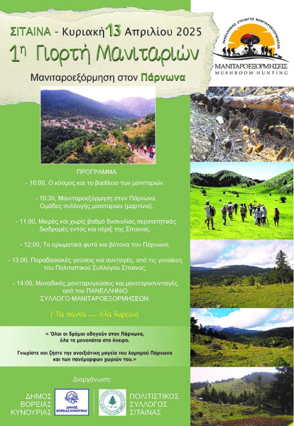 Ο Δήμος Βόρειας Κυνουρίας σε συνεργασία με τον Πολιτιστικό Σύλλογο Σίταινας διοργανώνουν την 1η Γιορτή Μανιταριών.