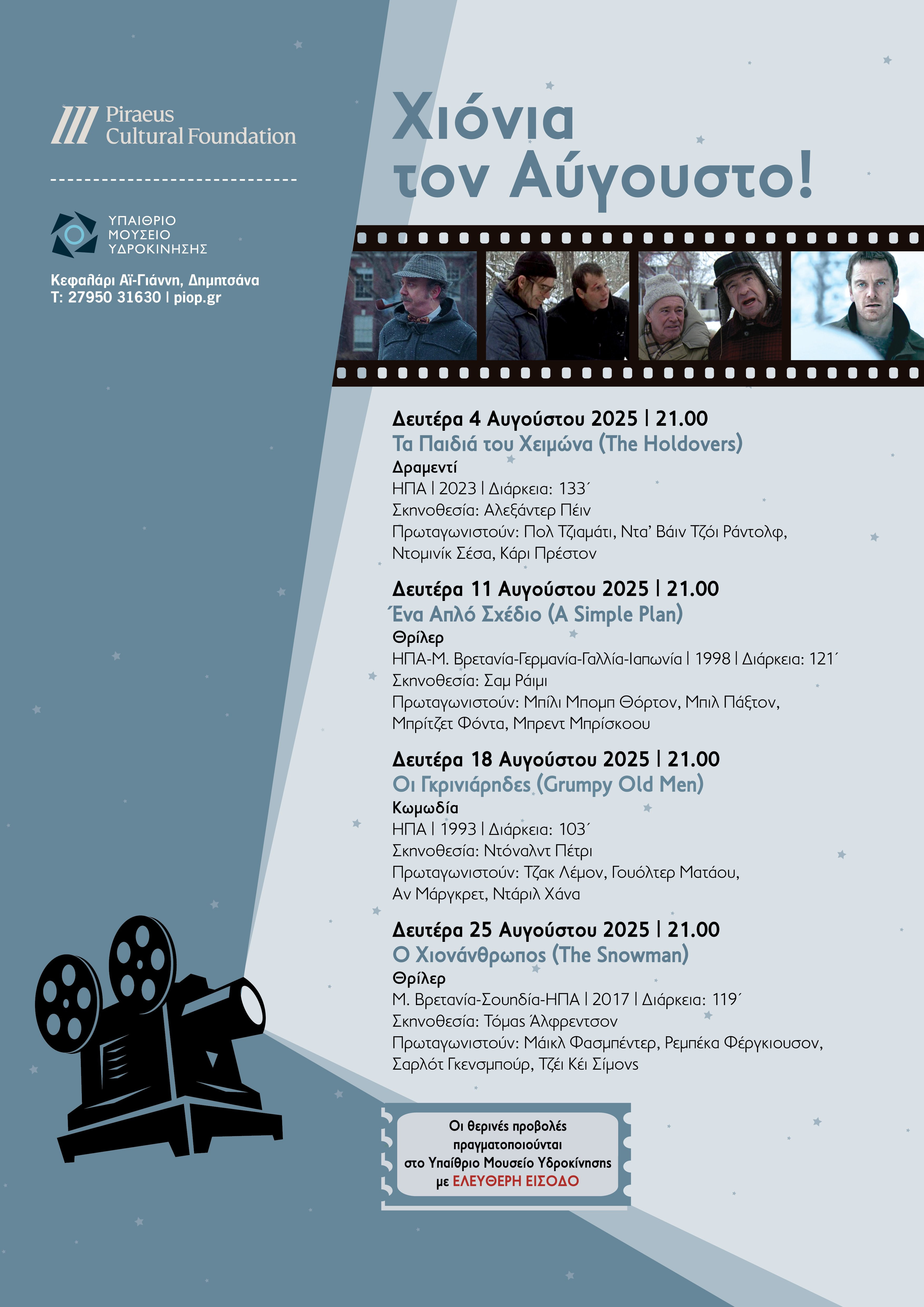 Το Πολιτιστικό Ίδρυμα Ομίλου Πειραιώς οργανώνει κάθε Δευτέρα, από τις 4 έως τις 25 Αυγούστου 2025, θερινό κινηματογραφικό αφιέρωμα με τίτλο «Χιόνια τον Αύγουστο!», στο Υπαίθριο Μουσείο Υδροκίνησης, στη Δημητσάνα. Το αφιέρωμα περιλαμβάνει ταινίες που οι υποθέσεις τους διαδραματίζονται σε χειμερινά χιονισμένα σκηνικά.