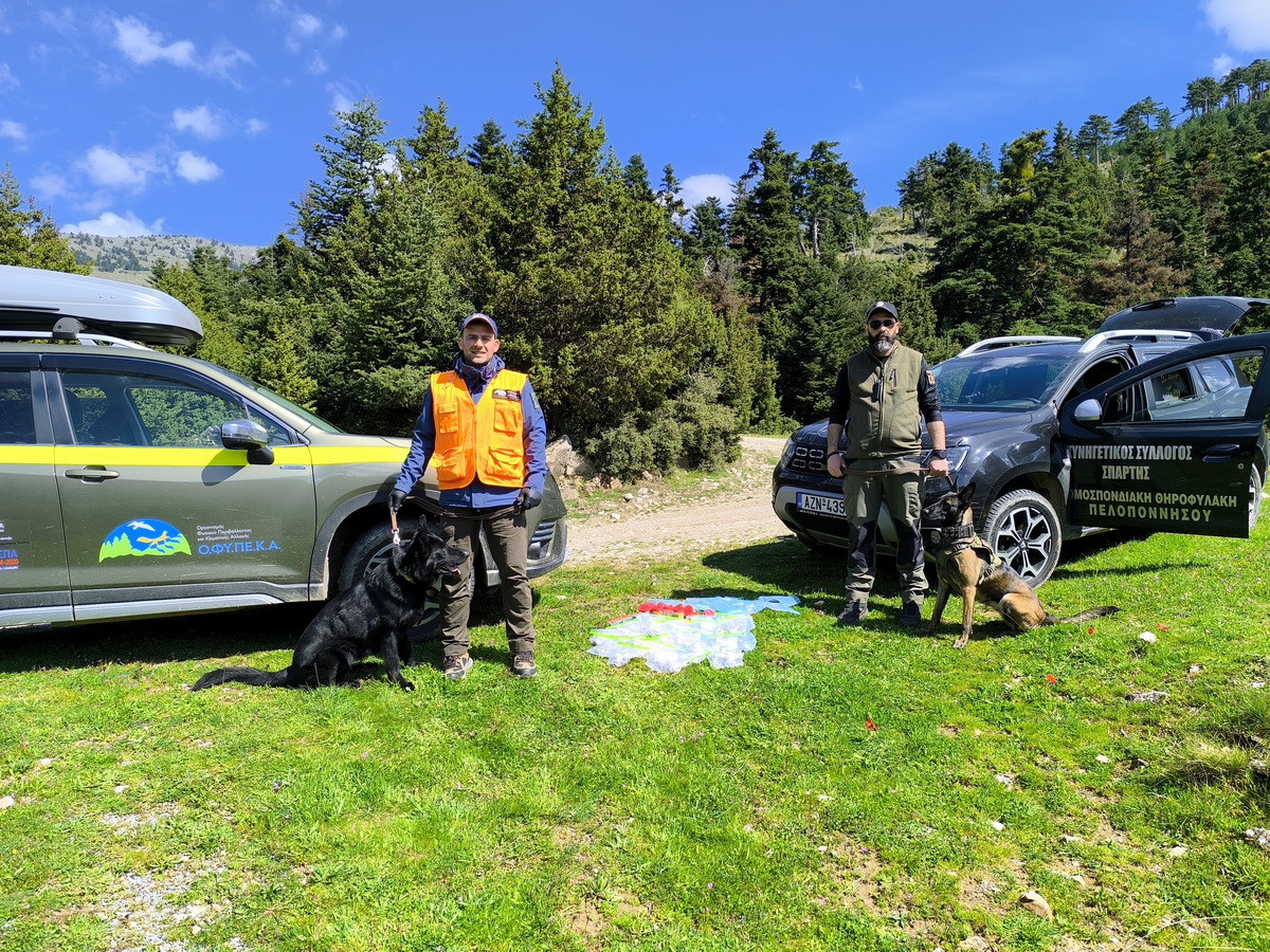 Τα πρώτα ανησυχητικά ευρήματα εντοπίστηκαν κατά τη διάρκεια προληπτικής έρευνας της ΕΜΑΔΔ του Κυνηγετικού Συλλόγου Σπάρτης από θηροφύλακα της Γ’ Κυνηγετικής Ομοσπονδίας Πελοποννήσου. Ακολούθησε άμεση ενημέρωση της αρμόδιας ΕΜΑΔΔ του ΟΦΥΠΕΚΑ και του Δασαρχείου Σπάρτης και οργανώθηκε συντονισμένη επιχείρηση τις επόμενες ημέρες. Κατά τη διάρκεια της κοινής δράσης, οι ειδικά εκπαιδευμένοι σκύλοι ανίχνευσης δηλητηριασμένων δολωμάτων, Ζωή και Brendy, εντόπισαν συνολικά 95 δηλητηριασμένα δολώματα, διάσπαρτα σε εκτεταμένη περιοχή μήκους σχεδόν 20 χιλιομέτρων.