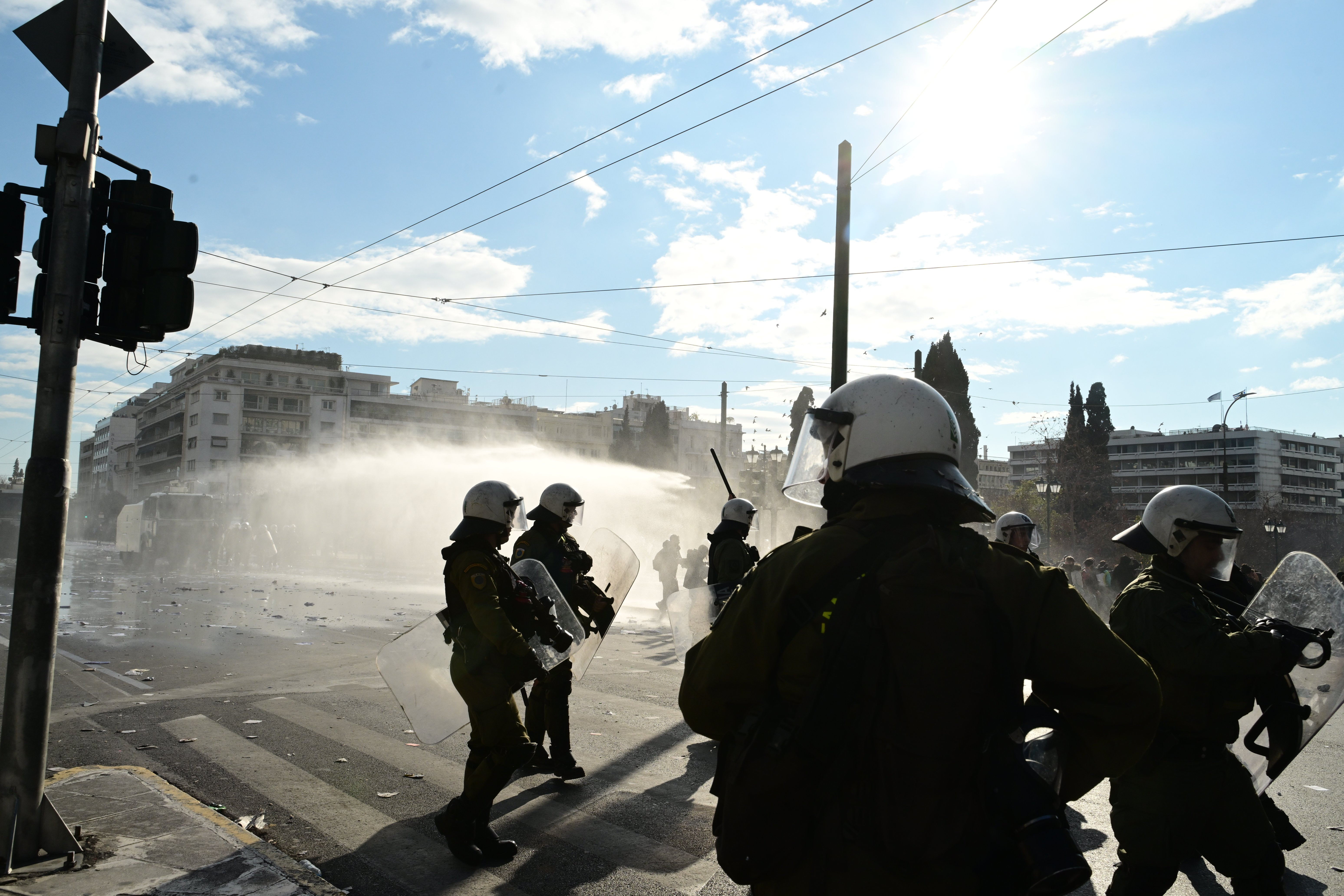 Οδομαχίες μεταξύ δυνάμεων της ΕΛ.ΑΣ. και κουκουλοφόρων στο Σύνταγμα σημειώθηκαν νωρίς το απόγευμα.