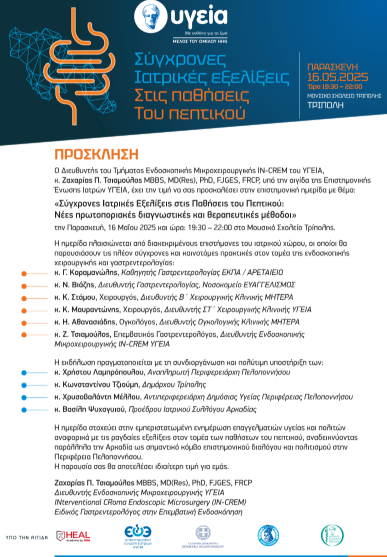 Μια υψηλού επιπέδου επιστημονική ημερίδα με τίτλο «Σύγχρονες Ιατρικές Εξελίξεις στις Παθήσεις του Πεπτικού: Νέες Πρωτοποριακές Διαγνωστικές και Θεραπευτικές Μέθοδοι» θα πραγματοποιηθεί την Παρασκευή 16 Μαΐου 2025, από τις 19:30 έως τις 22:00, στο Μουσικό Σχολείο Τρίπολης.