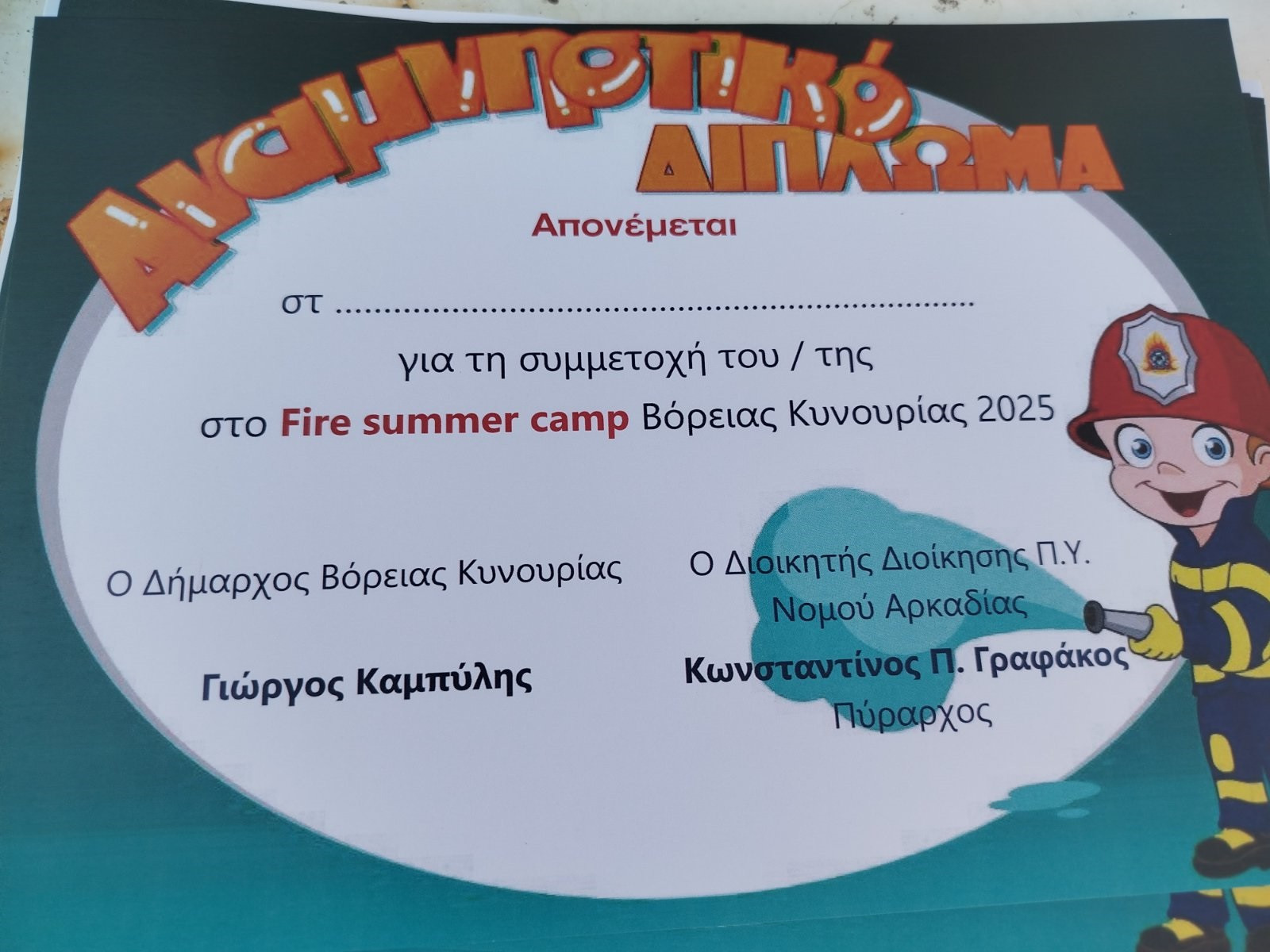 Την ευθύνη και τον σχεδιασμό για την διεξαγωγή των δράσεων Fire summer camp είχε ο Διοικητής Διοίκησης των Πυροσβεστικών Υπηρεσιών Αρκαδίας Πύραρχος Κωνσταντίνος Γραφάκος.
