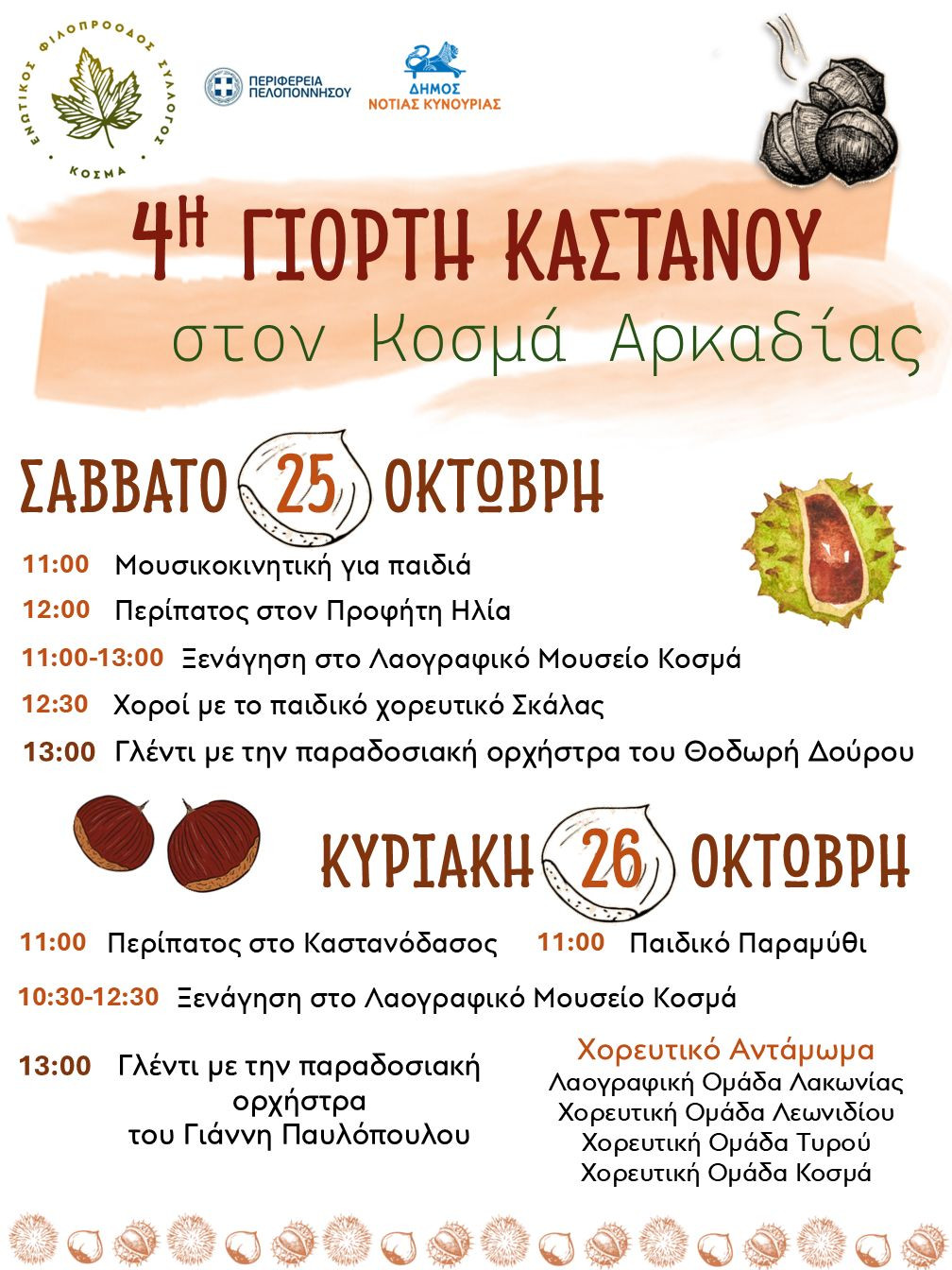 Η 4η Γιορτή Κάστανου στον Κοσμά Αρκαδίας είναι μια μοναδική ευκαιρία για να απολαύσουν οι επισκέπτες τη φύση, τη μουσική, τη γαστρονομία και την παράδοση ενός από τα πιο όμορφα ορεινά χωριά της Πελοποννήσου.