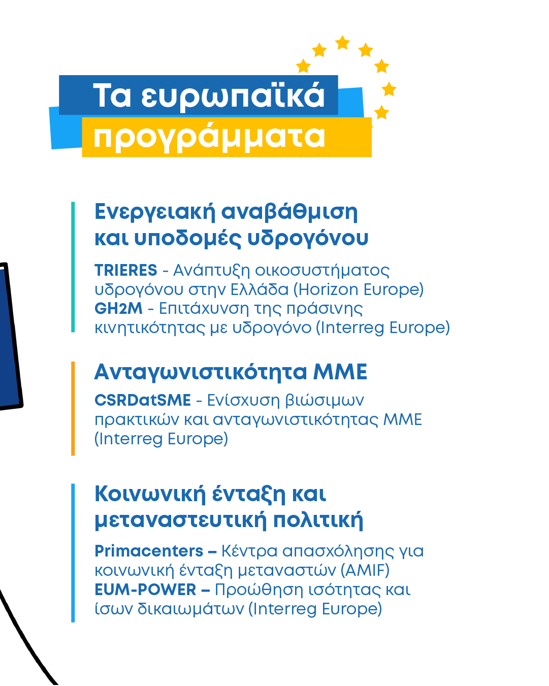 Τα εν λόγω ευρωπαϊκά προγράμματα αγγίζουν διάφορους τομείς του επιστητού, καλύπτοντας κρίσιμους τομείς καινοτομίας, πράσινης μετάβασης, κοινωνικής συνοχής και επιχειρηματικότητας.
