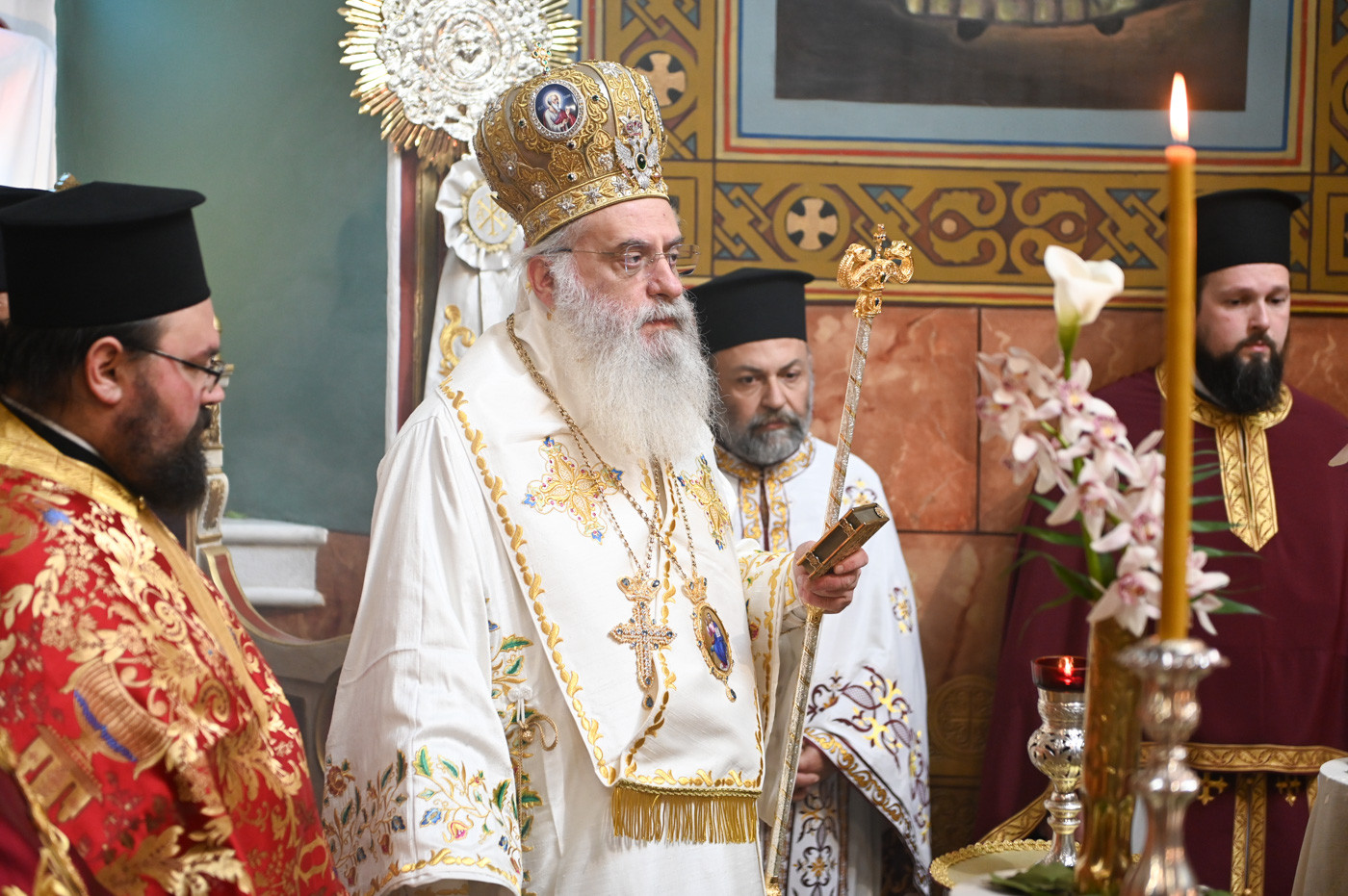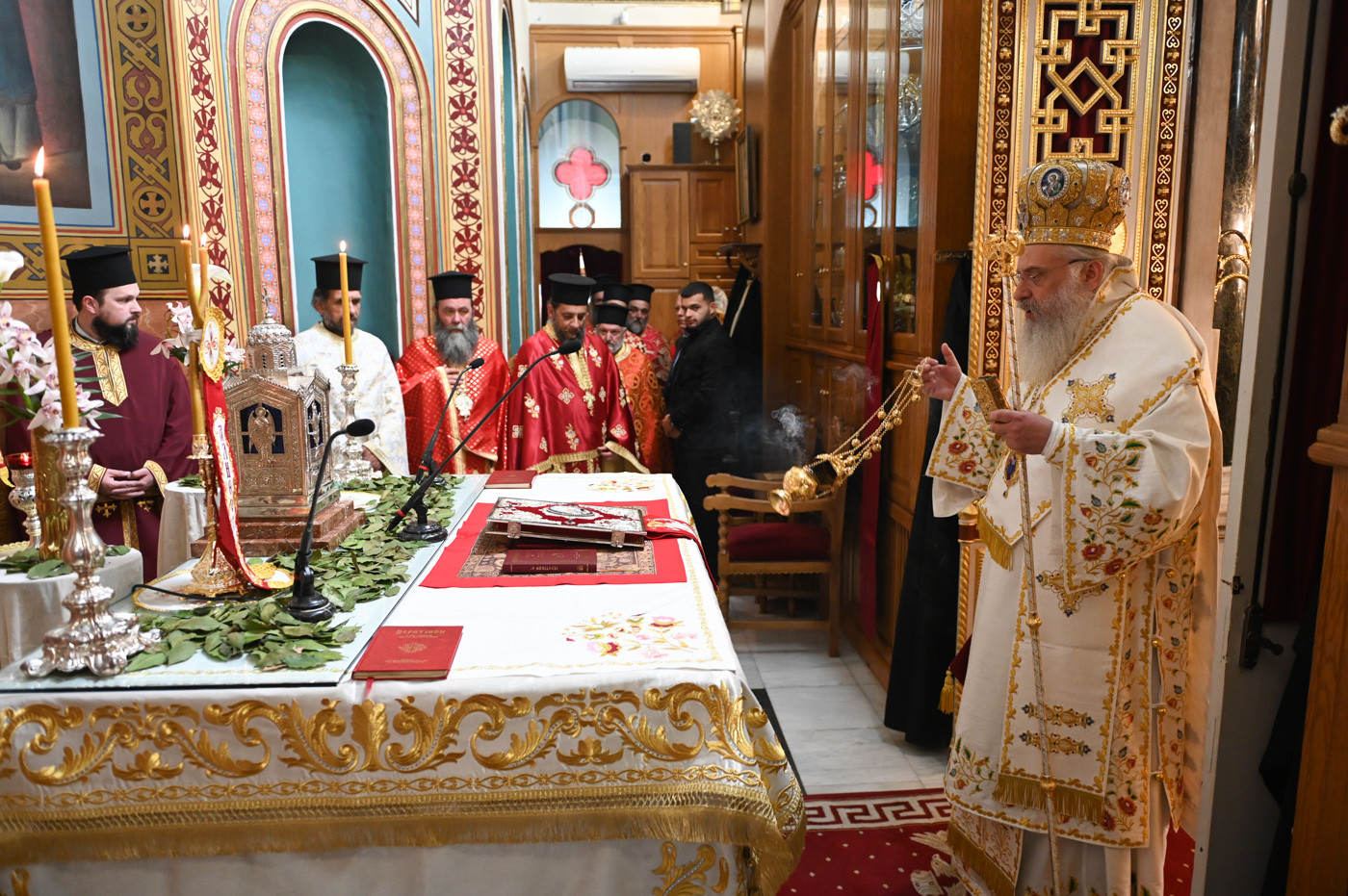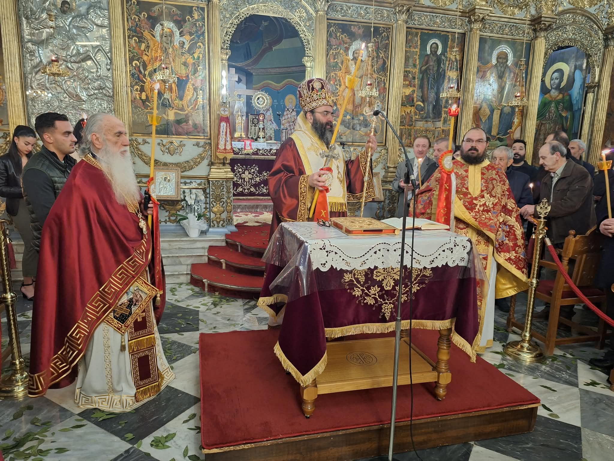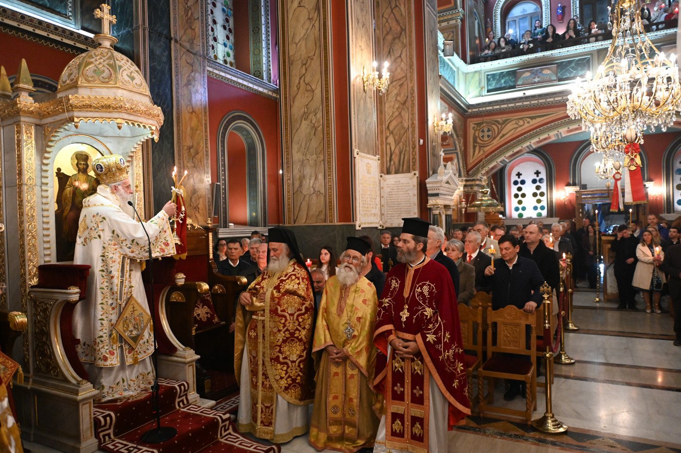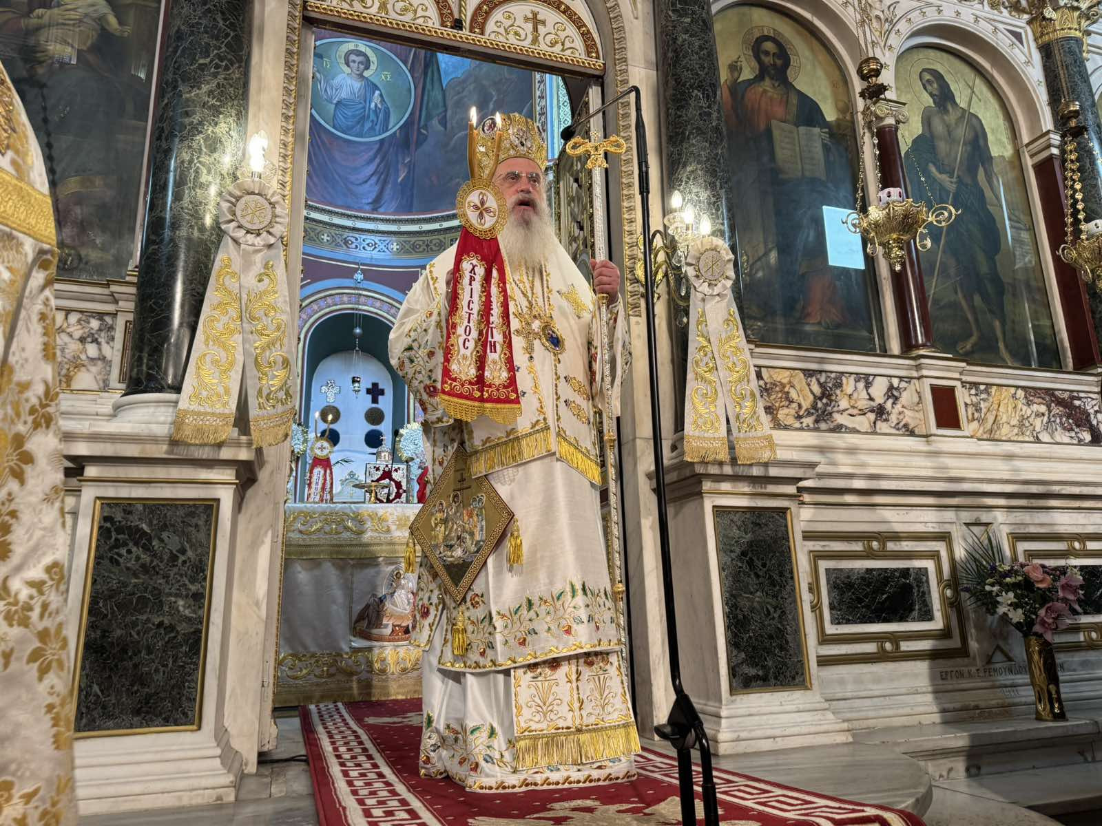 Ο Μητροπολίτης μετά την ανάγνωση του Ιερού Ευαγγελίου και υπό τους ήχους χαρμοσύνων κωδωνοκρουσιών, ανήγγειλε το «Χριστός Ανέστη». Εν συνεχεία, τέλεσε την Πανηγυρική Αναστάσιμη Θεία Λειτουργία πλαισιούμενος από τον Πρωτοσύγκελλο της Ιεράς Μητροπόλεως Πανοσιολ. Αρχιμ. Στέφανο Καππέ και τον Διάκονο π. Αλέξιο Ζαρζάνη. Παρέστησαν ο Αναπλ. Περιφερειάρχης κ. Λαμπρόπουλος, Αντιδήμαρχοι, Περιφερειακοί και Δημοτικοί Σύμβουλοι, εκπρόσωποι των Ενόπλων Δυνάμεων και των Σωμάτων Ασφαλείας.