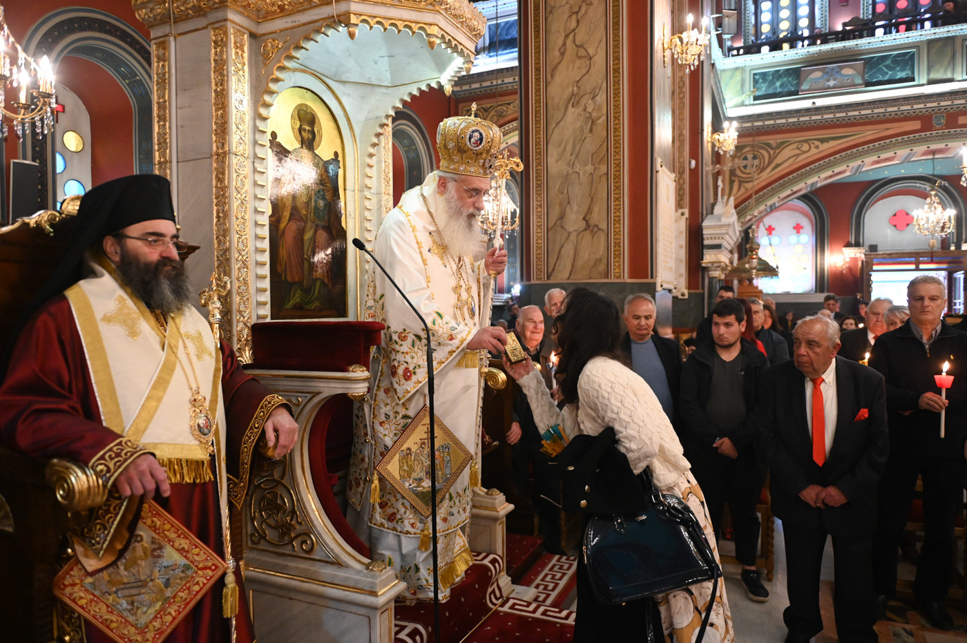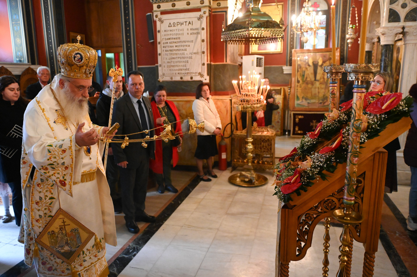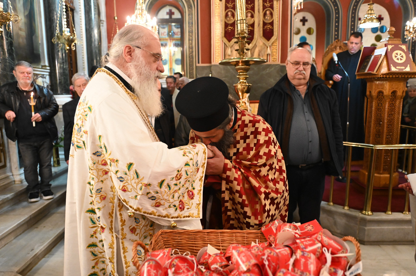 Με το πέρας του Εσπερινού ο Μητροπολίτης διένειμε σε Ιερείς, άρχοντες και πιστούς κόκκινα αυγά αναφωνώντας τον Αναστάσιμο χαιρετισμό “Χριστός Ανέστη”