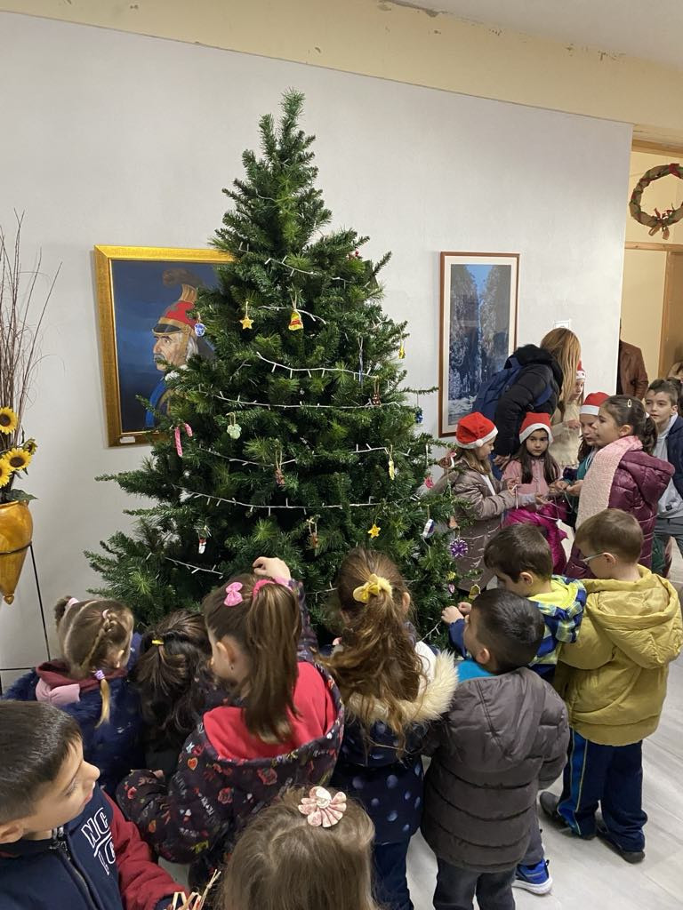 Τα παιδιά ήρθαν μαζί με τους δασκάλους τους φέρνοντας μαζί τους τα χειροποίητα στολίδια που είχαν ετοιμάσει και τα κρέμασαν στο δένδρο που βρίσκεται στην κεντρική αίθουσα του κτιρίου.