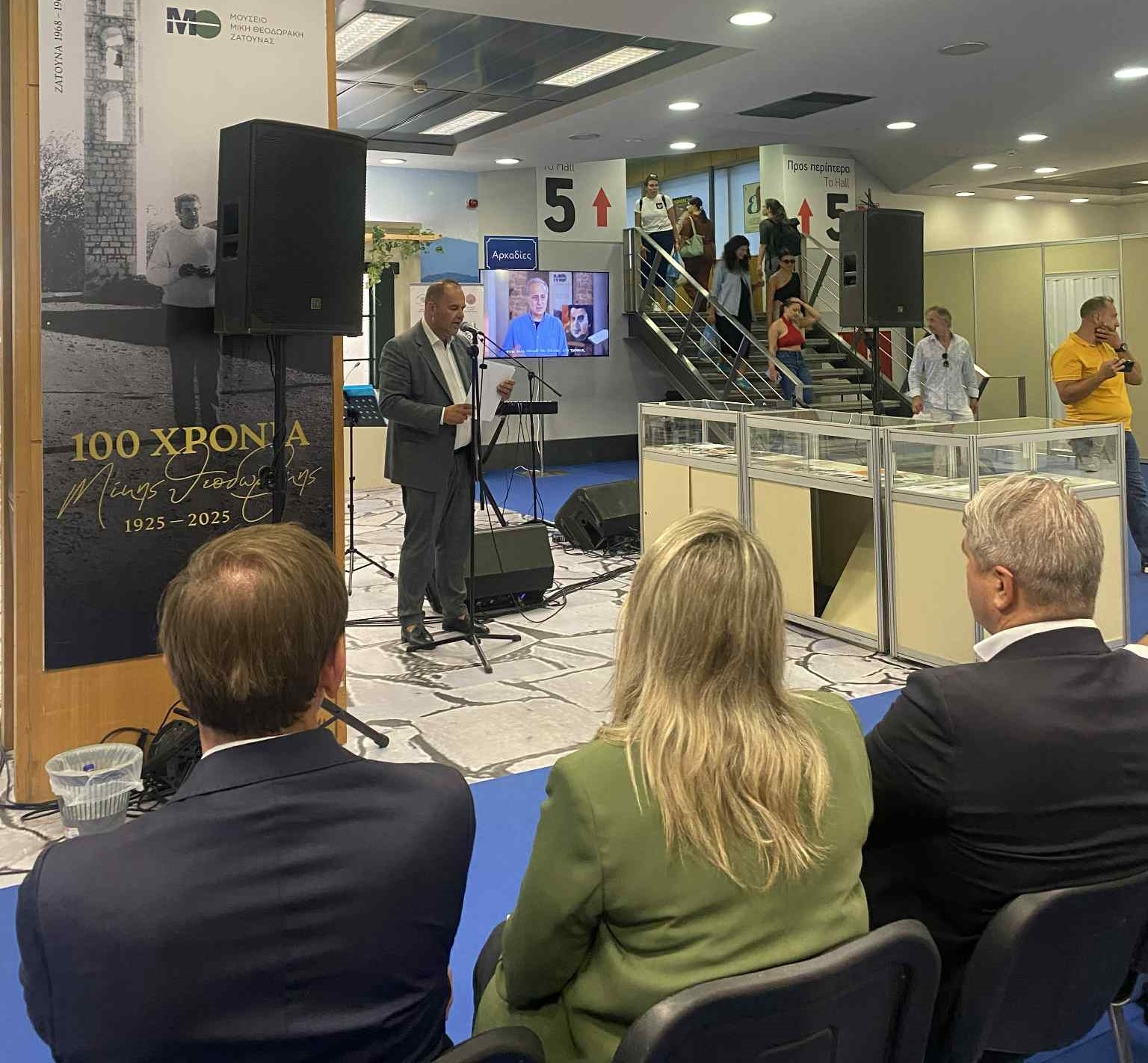 Ο Πρόεδρος του Μουσείου Μίκη Θεοδωράκη Ζάτουνας Παρασκευάς Παρασκευόπουλος στην ομιλία του καλωσόρισε τους παριστάμενους και μετέφερε τους χαιρετισμούς του επίτιμου προέδρου του Μουσείου σκηνοθέτη Κώστα Γαβρά, τονίζοντας: «είμαστε ένα μουσείο εθελοντών… Η απόφαση του Δ.Σ. της ΔΕΘ να τιμήσει το Μίκη φιλοξενώντας το Μουσείο του, με την εικαστική αναπαράσταση του εμβληματικού καφενείου του, που καθημερινά και με αστυνομική συνοδεία επισκέπτονταν στη Ζάτουνα, όπου παρέμεινε το 1968 και το 1969 εκτοπισμένος από την δικτατορία, με μουσειακά - ιστορικά ντοκουμέντα από το φυσικό Μουσείο, με την προβολή ενός θαυμάσιου ντοκιμαντέρ για τη ζωή και την καλλιτεχνική και πατριωτική του δράση καθώς και με την παρουσίαση του πρώτου στην Ελλάδα Ψηφιακού Εικονικού Μουσείου Μίκη Θεοδωράκη Ζάτουνας αποτελεί ξεχωριστή τιμή».