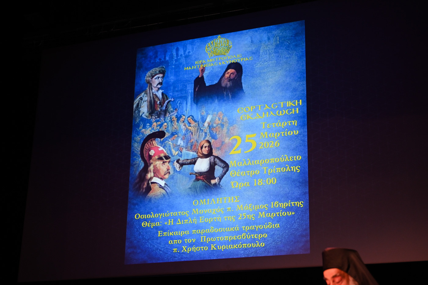 Επετειακή εκδήλωση της Ιεράς Μητροπόλεως Μαντινείας και Κυνουρίας για τον διπλό εορτασμό του Ευαγγελισμού της Θεοτόκου και της Εθνικής Επετείου της 25ης Μαρτίου του 1821 πραγματοποιήθηκε χθες το απόγευμα, Τετάρτη 25 Μαρτίου, στο κατάμεστο από κόσμο Μαλλιαροπούλειο Θέατρο στην Τρίπολη.