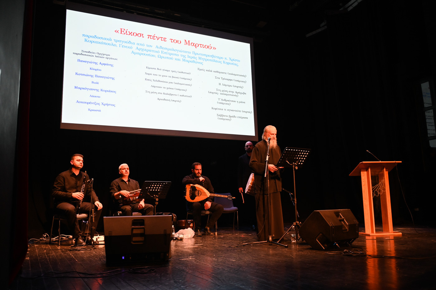 Με το πέρας της ομιλίας, ακολούθησαν επίκαιρα παραδοσιακά τραγούδια από τον Αρκά Αιδεσιμ. Πρωτοπρ. Χρίστο Κυριακόπουλο, Γενικό Αρχιερατικό της Ι. Μητροπόλεως Κηφισίας, Αμαρουσίου, Ωρωπού και Μαραθώνος, οποίος γέμισε το κοινό με αισθήματα εθνικής ανάτασης και υπερηφάνειας.