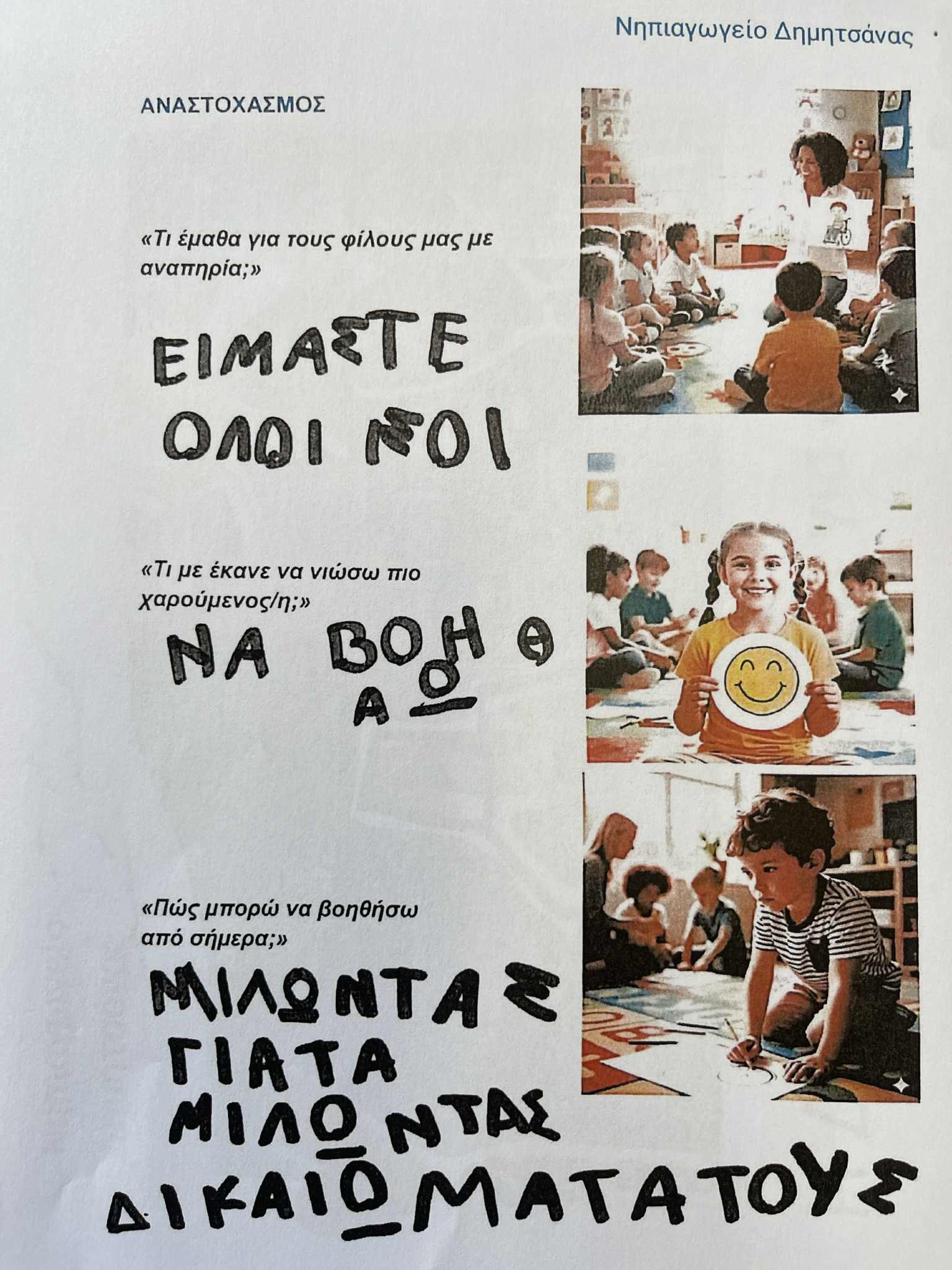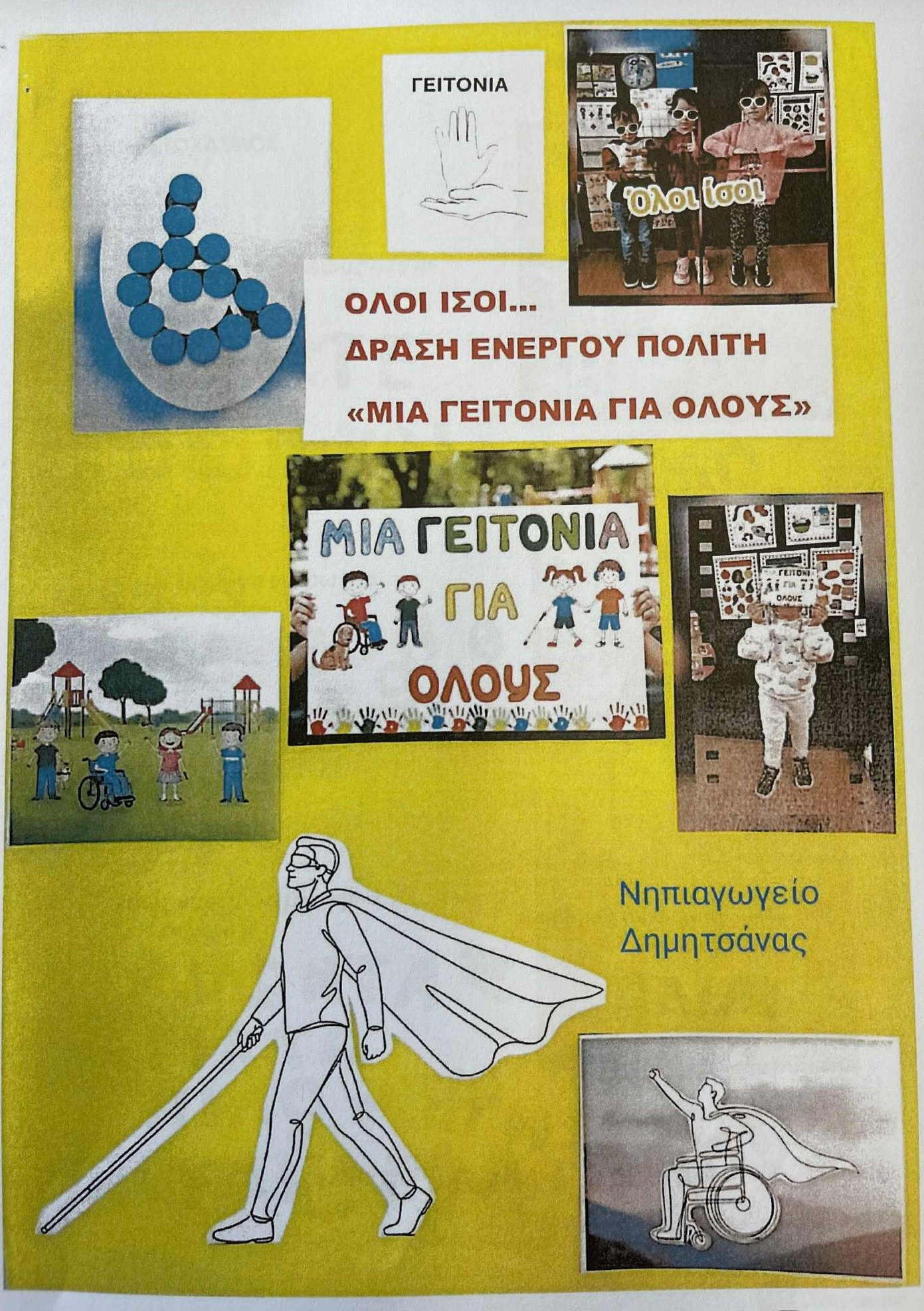 Ένα τρυφερό μήνυμα από τη νέα γενιά προς όλους, πως μια «γειτονιά για όλους» είναι εφικτή όταν υπάρχει διάθεση κατανόησης, σεβασμού και συλλογικής ευθύνης, μετέφεραν οι μικροί μαθητές του Νηπιαγωγείου Δημητσάνας, στην ιδιαίτερα ζεστή επίσκεψη τους στο Δημαρχείο Δημητσάνας, όπου παρουσίασαν στο Δήμαρχο Γορτυνίας Ευστάθιο Κούλη και μέλη της Δημοτικής Αρχής, το αποτέλεσμα της δημιουργικής τους εργασίας στο πλαίσιο της δράσης «Μία γειτονιά για όλους», του προγράμματος σπουδών «Δράσεις Ενεργού Πολίτη».