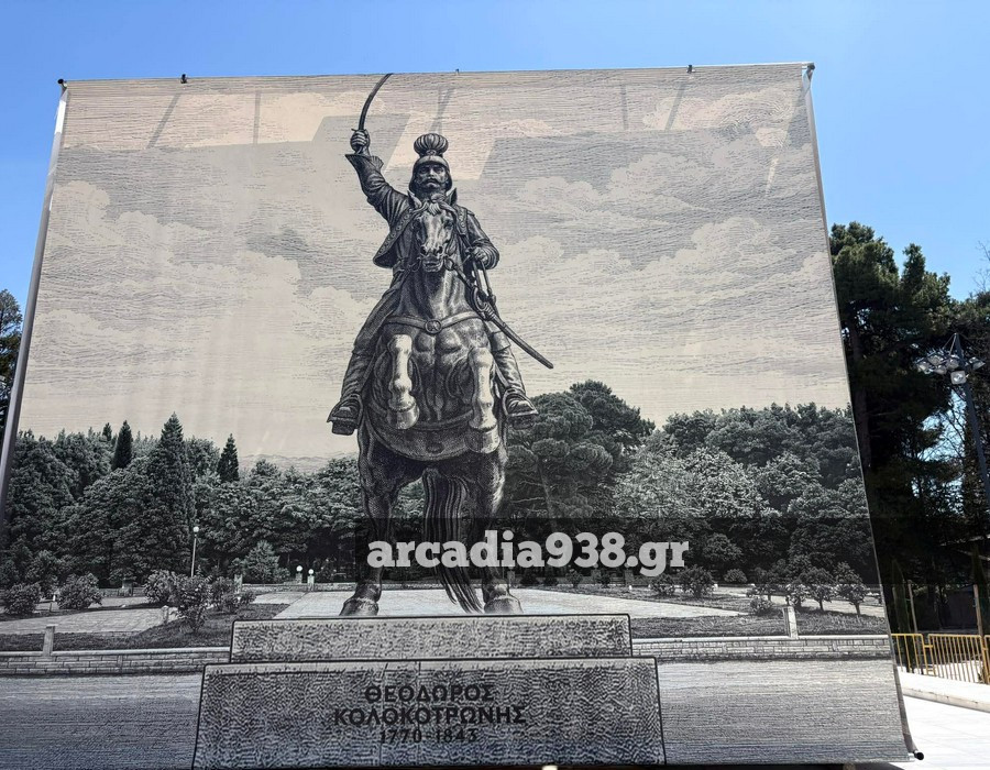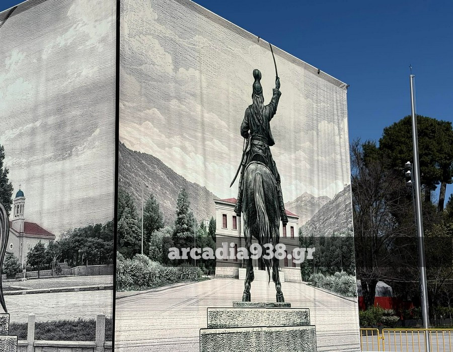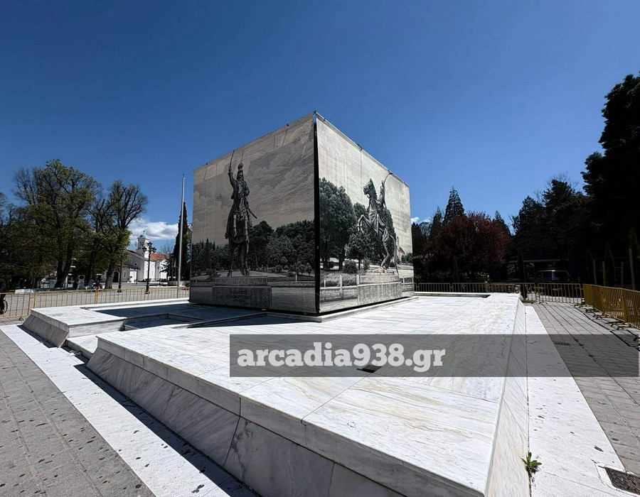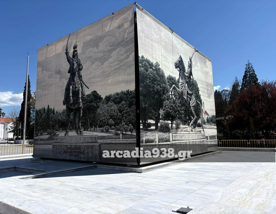 Ο δήμος Τρίπολης προχώρησε στην τοποθέτηση μεγάλων διαστάσεων φωτογραφιών περιμετρικά του βάθρου, που αναπαριστούν τον έφιππο ανδριάντα.