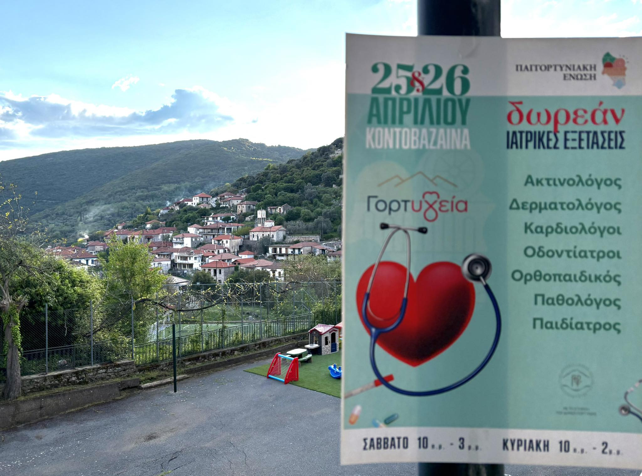 Με επιτυχία ολοκληρώθηκε η 1η Δράση του προγράμματος «Γορτ-Υγεία», που διοργάνωσε για πρώτη φορά, η Παγγορτυνιακή Ένωση με την υποστήριξη του Δήμου Γορτυνίας, η οποία έλαβε χώρα στο Περιφερειακό Ιατρείο Κοντοβάζαινας (παλαιό Δημαρχείο) και σε αίθουσες του παρακείμενου Σχολικού Συγκροτήματος στην Κοντοβάζαινα, το διήμερο Σάββατο 25 και Κυριακή 26 Απριλίου 2026.