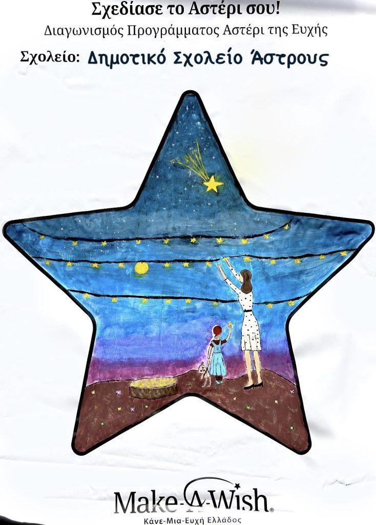 Με ιδιαίτερη χαρά και περηφάνια ανακοινώνουμε ότι το σχολείο μας κέρδισε το πρώτο βραβείο στον διαγωνισμό “Σχεδίασε το Αστέρι σου” του Make a Wish (Κάνε μια Ευχή Ελλάδας) στην κατηγορία Γ & Δ τάξη γενικής αγωγής, αναφέρει το δελτίο Τύπου που αναρτήθηκε στην επίσημη σελίδα του Δημοτικού Σχολείου Άστρους.