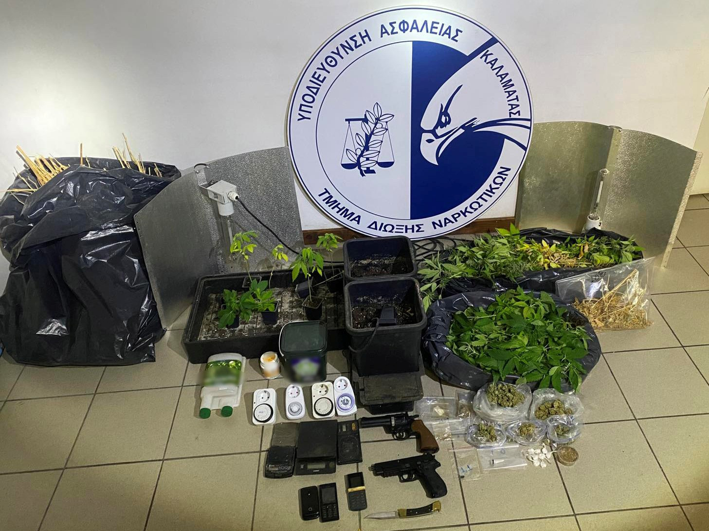 Οι εμπεριστατωμένες έρευνες, οδήγησαν τους αστυνομικούς του Τμήματος Δίωξης Ναρκωτικών της Υποδιεύθυνσης Δίωξης και Εξιχνίασης Εγκλημάτων Καλαμάτας, στη σύλληψη -2- ημεδαπών, ηλικίας 71 και 45 ετών αντίστοιχα, σε βάρος των οποίων σχηματίσθηκε δικογραφία για τα ναρκωτικά και για παράβαση της νομοθεσίας για τα όπλα.
