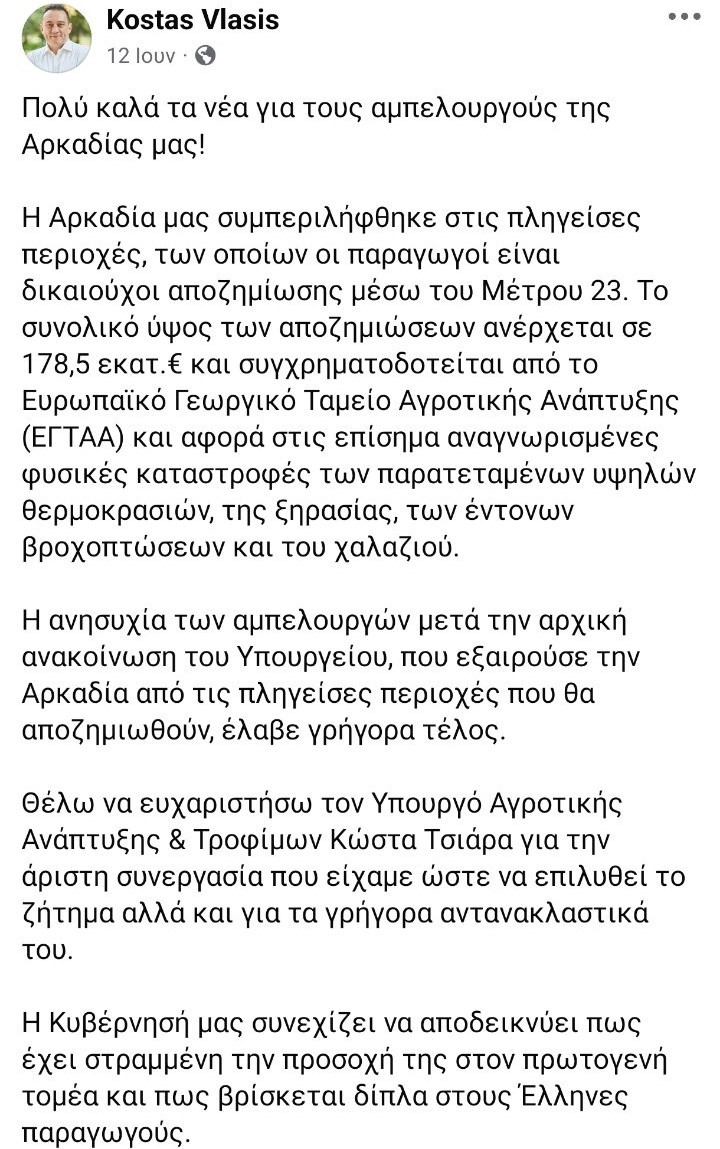 Στις 12 Ιουνίου, ο βουλευτής Αρκαδίας και υφυπουργός κ. Κώστας Βλάσης, με δημόσια ανάρτησή του στα social media , μετά από συνάντησή του με τον Υπουργό Αγροτικής Ανάπτυξης κ. Τσιάρα ανέφερε: