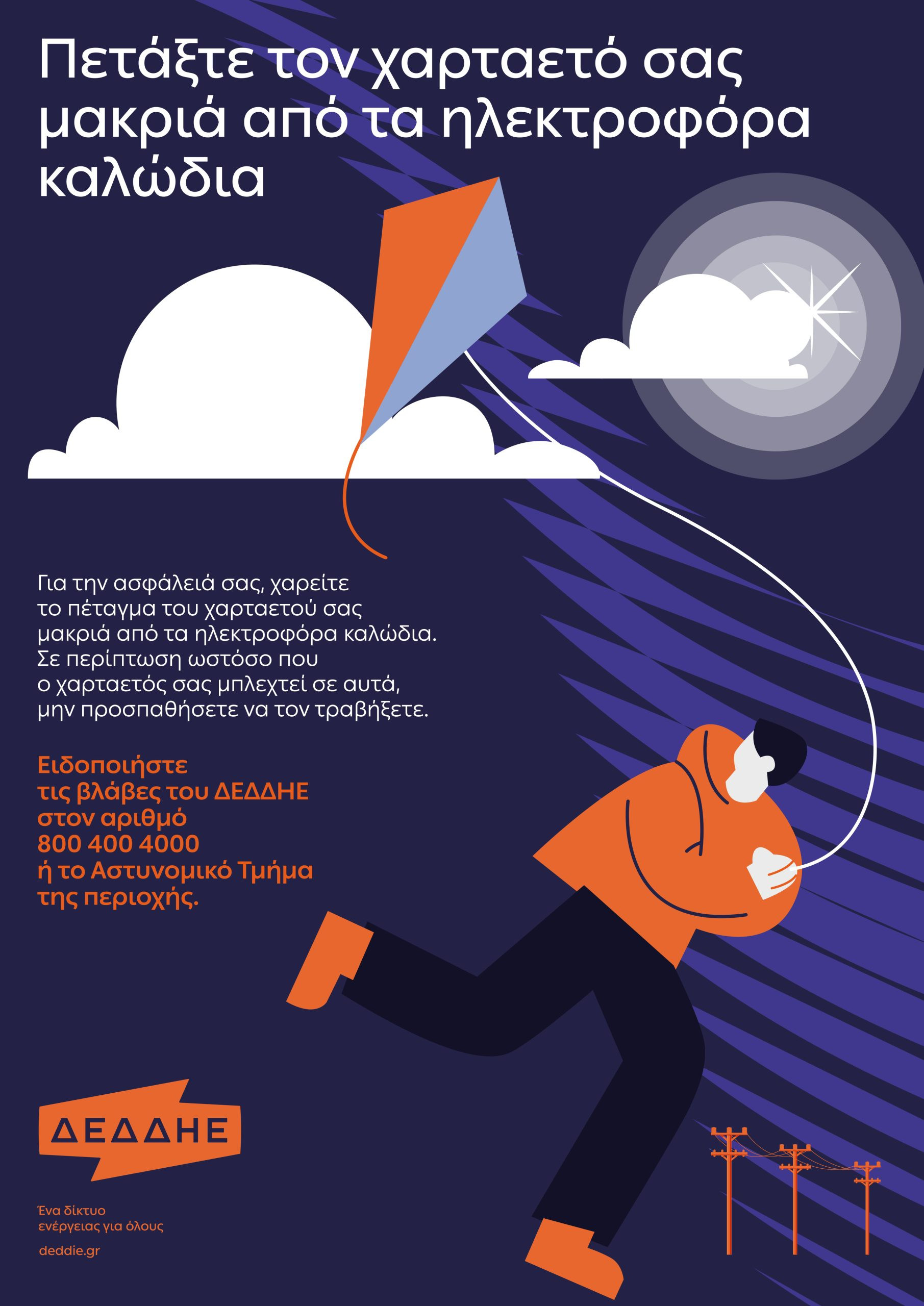 - μην προσπαθήσετε να αναρριχηθείτε σε στύλους διανομής ηλεκτρικού ρεύματος ή ηλεκτροφωτισμού, ούτε και σε σημεία που βρίσκονται κοντά σε ηλεκτροφόρα καλώδια. Σε κάθε περίπτωση που θα χρειαστείτε βοήθεια ειδοποιείστε τις βλάβες του ΔΕΔΔΗΕ, μέσω της τηλεφωνικής γραμμής 800 400 4000 (Τηλεφωνικό Κέντρο Εξυπηρέτησης & Βλαβών), μέσω της εφαρμογής κινητού MyDEDDIEApp ή μέσω της online δήλωσης βλάβης στην ιστοσελίδα www.deddie.gr. Εναλλακτικά επικοινωνήστε με το Αστυνομικό Τμήμα της περιοχής Για την ταχεία αποκατάσταση τυχόν βλαβών από το πέταγμα των χαρταετών, ο ΔΕΔΔΗΕ θα έχει αυξημένα συνεργεία σε όλες τις Υπηρεσίες του ανά την Επικράτεια.