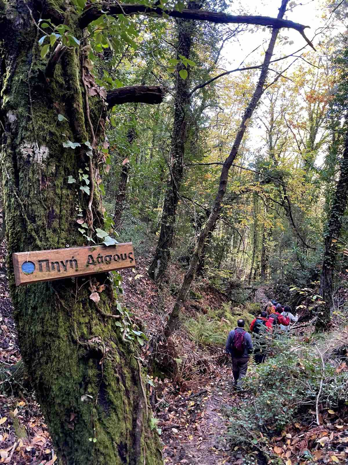 Τα πρώτα χιλιόμετρα έγιναν μέσα στο πανέμορφο δάσος της Σκιρίτιδας, περπατήσαμε ανάμεσα σε πυκνή βλάστηση, όπου συναντήσαμε αιωνόβιες καστανιές, καρυδιές και πεύκα που εναλλάσσονταν με πυκνά πλατάνια, βελανιδιές και έλατα.