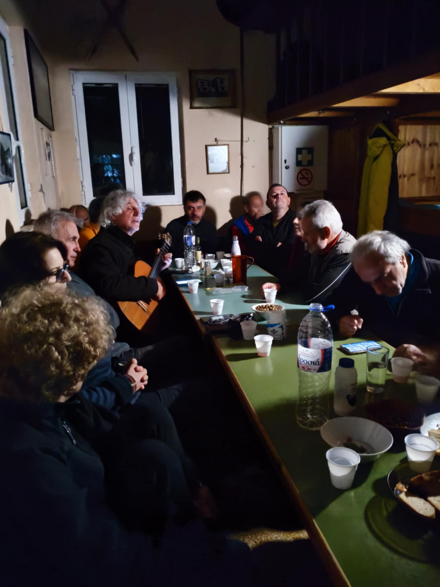 Αφού τακτοποιηθήκαμε στο καταφύγιο, ένα από τα παλιότερα της Ελλάδας, και στην ‘’Καλύβα ‘’, έναν όμορφο και περιποιημένο χώρο, σε μικρή απόσταση από το καταφύγιο, ακολούθησε δείπνο με φαγητό που ετοίμασαν οι υπεύθυνοι του καταφυγίου.