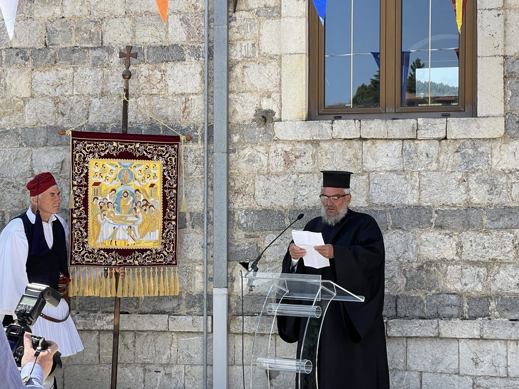 Στο χαιρετισμό του ο εφημέριος του Ναού πρωτοπρεσβύτερος π. Θεμιστοκλής Δουρίδας καλωσόρισε τους επίσημους παρευρισκόμενους καθώς και το πλήθος κόσμου που τίμησε την εκδήλωση και εξέφρασε ευχαριστίες σε όσους συνέβαλαν στην ανέγερση των προτομών και στη διοργάνωση της εκδήλωσης, τονίζοντας την καθοριστική συμβολή της Ιεράς Μητρόπολης Γόρτυνος και Μεγαλοπόλεως, των απογόνων των δύο ηρώων και του Δήμου Γορτυνίας