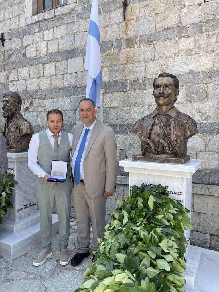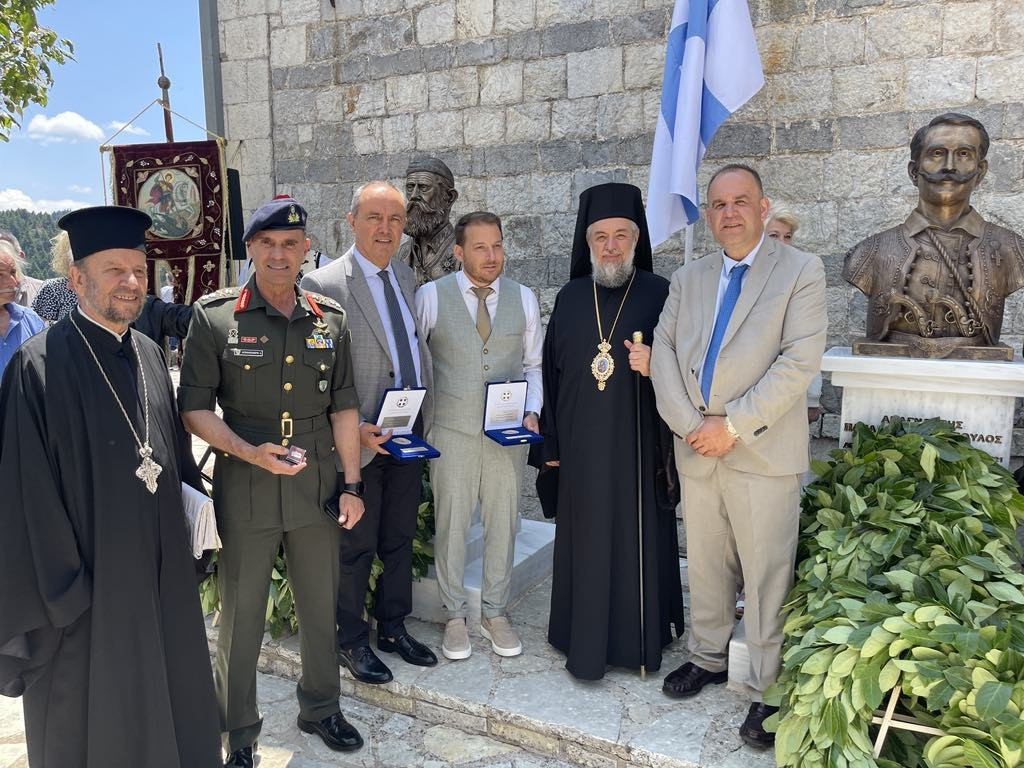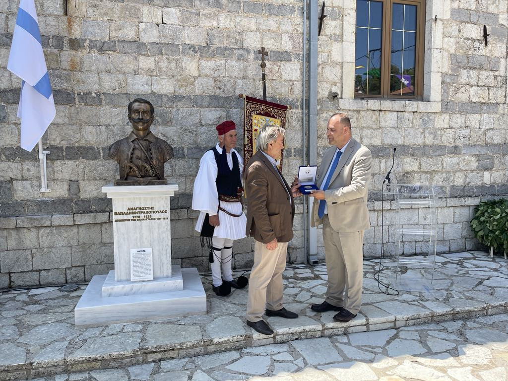 Ο Δήμαρχος Γορτυνίας μετά το τέλος του χαιρετισμού με βαθιά συγκίνηση, απένειμε ως ένδειξη ευγνωμοσύνης, το μετάλλιο του Δήμου Γορτυνίας στον εφημέριο του Ναού πατέρα Θεμιστοκλή Δουρίδα που πρωτοστάτησε στην διαδικασία ανέγερσης των προτομών και διοργάνωσης της εκδήλωσης, στον διακεκριμένο γλύπτη των προτομών κο Ευάγγελο Τύμπα για τα φιλοτεχνημένα με συγκινητική ακρίβεια και επιμονή στη ρεαλιστική απεικόνιση έργα του, στους εκπρόσωπους των οικογενειών των απόγονων των ηρώων κους Κώστα Παναγούλια και Κώστα Παπαδημητρακόπουλου που πρωτοστάτησαν στην ιδέα και υλοποίηση της ανέγερσης των προτομών.