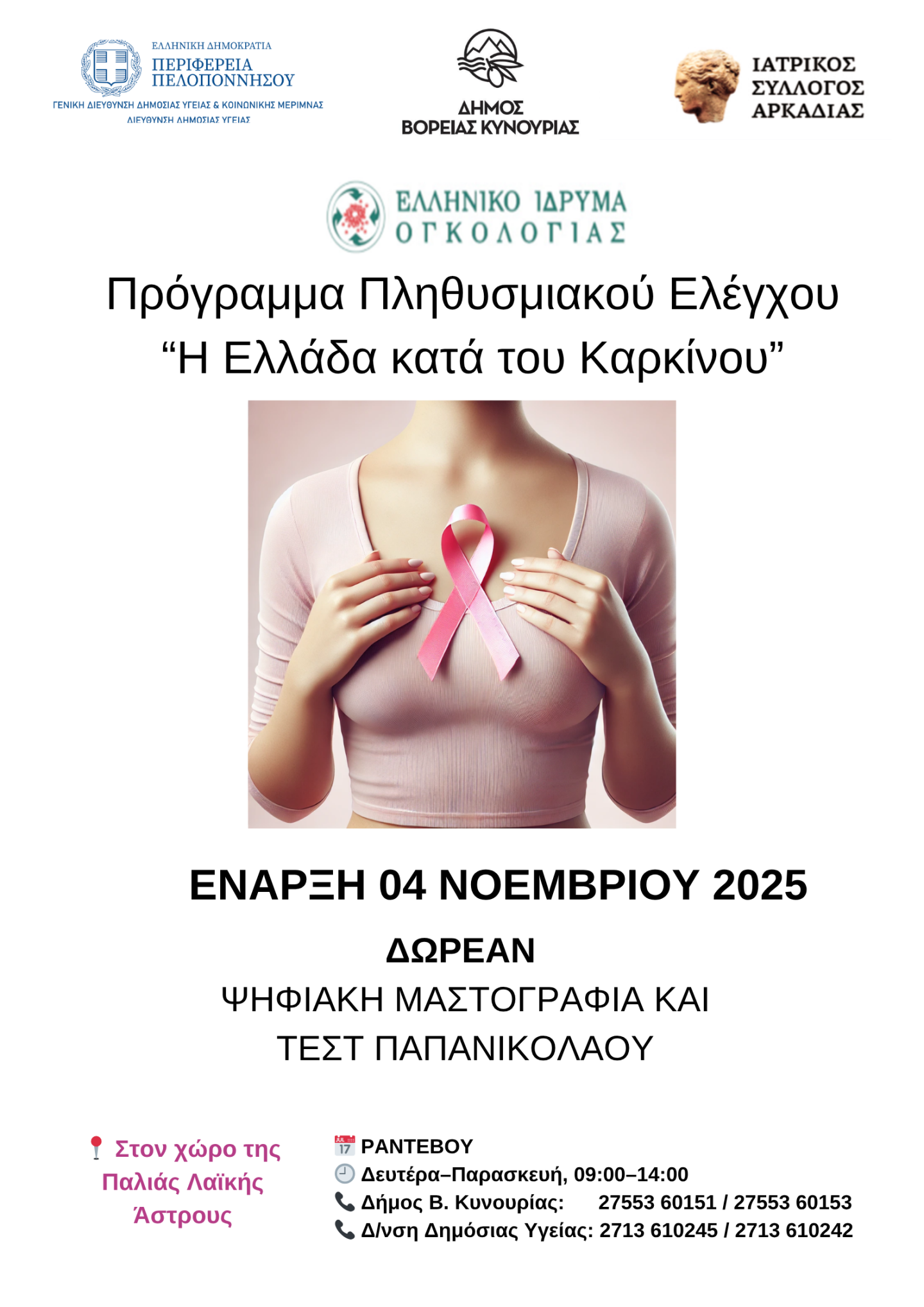 Ο Δήμος Βόρειας Κυνουρίας ανακοινώνει τη συνέχεια της διενέργειας των δωρεάν προληπτικών εξετάσεων (Ψηφιακής Μαστογραφίας και Τεστ Παπανικολάου) στο πλαίσιο του προγράμματος «Ελλάδα κατά του Καρκίνου», μέσω της Κινητής Μονάδας του Ελληνικού Ιδρύματος Ογκολογίας.