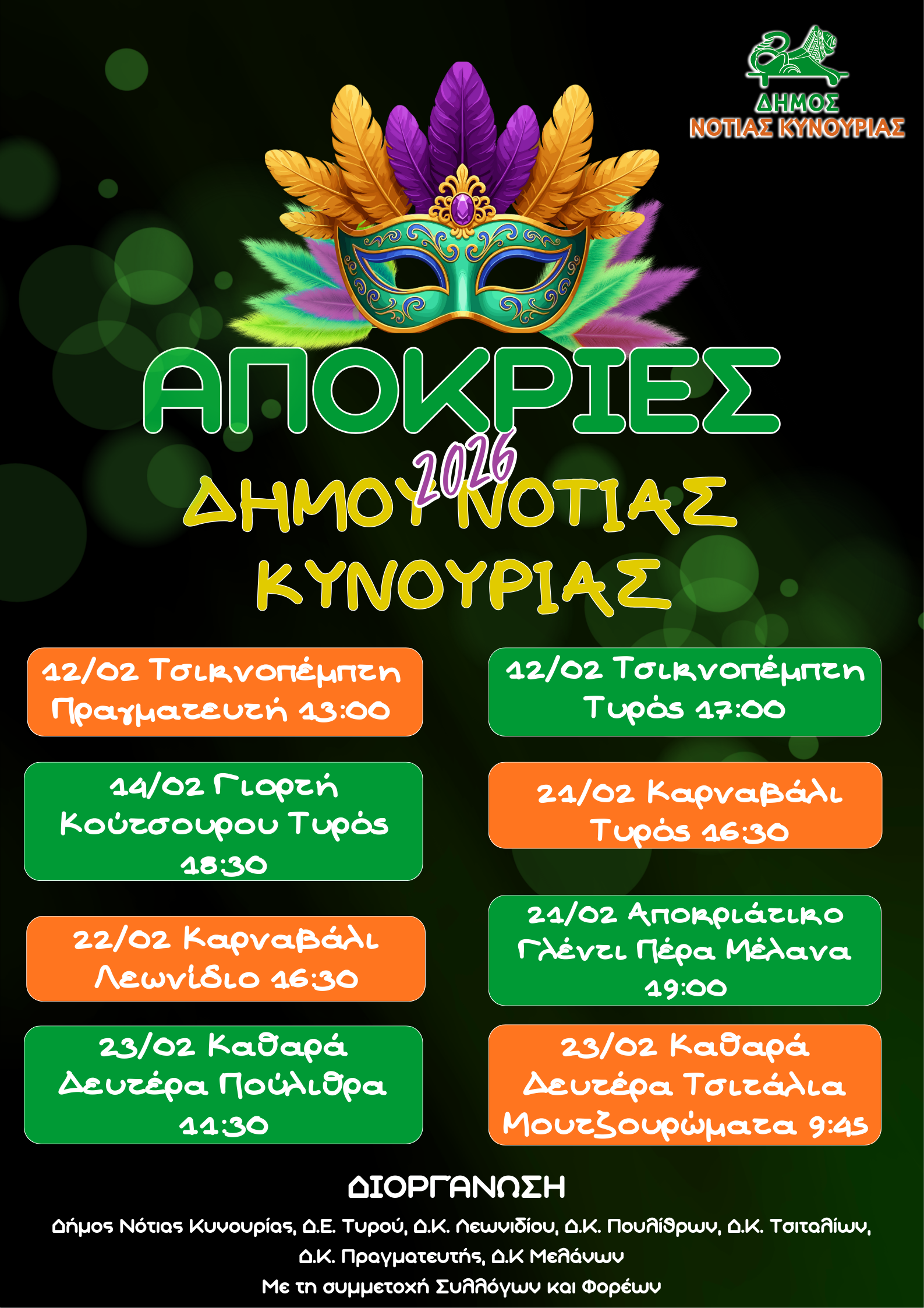 Ο Δήμος Νότιας Κυνουρίας στα πλαίσια των αποκριάτικων εκδηλώσεων, ανακοινώνει τις δράσεις της φετινής αποκριάτικης περιόδου!