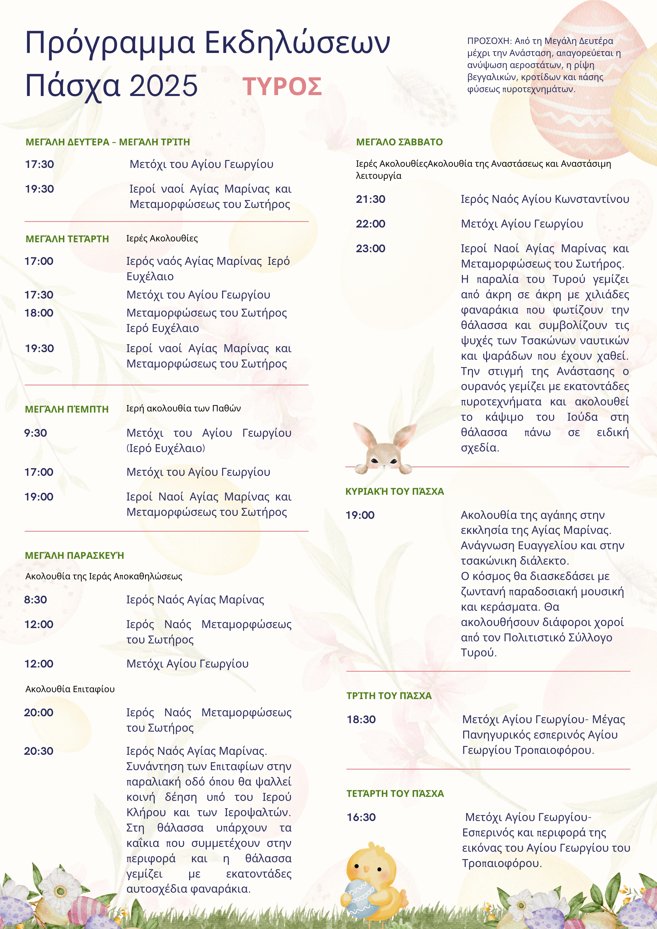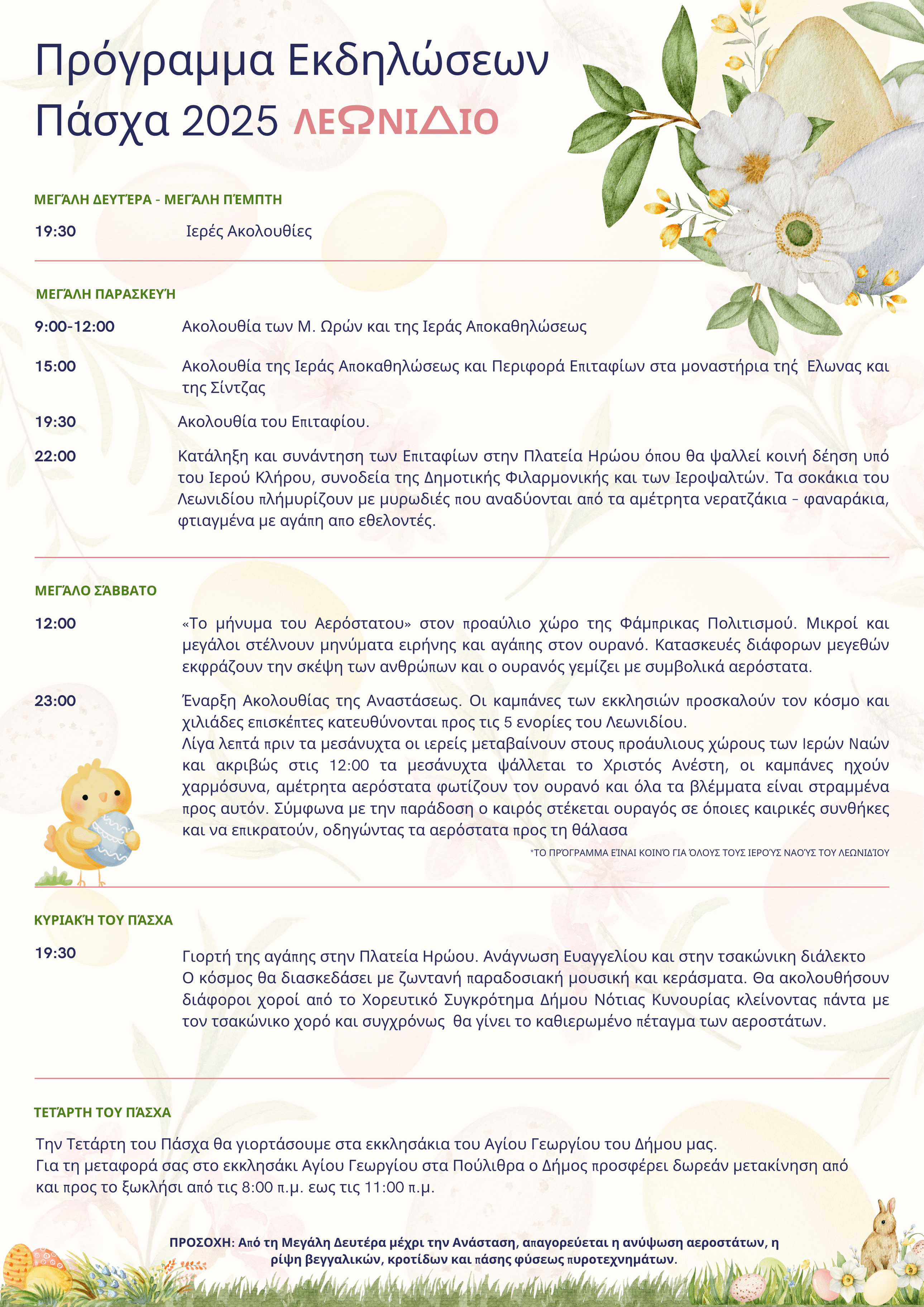 Το πρόγραμμα των πασχαλινών εκδηλώσεων σε Λεωνίδιο και Τυρό