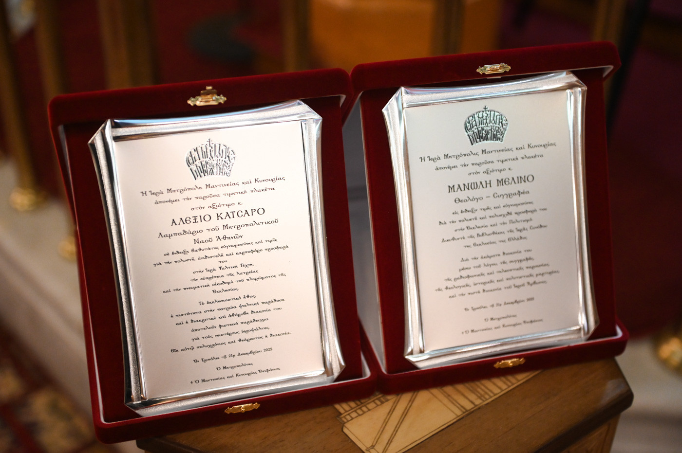 Στο τέλος της εκδήλωσης, ο Σεβασμιώτατος Μητροπολίτης Μαντινείας και Κυνουρίας κ. Επιφάνιος, ως ένδειξη ευγνωμοσύνης και τιμής για την προσφορά τους στην Εκκλησία, απένειμε τιμητικές πλακέτες τόσο στον