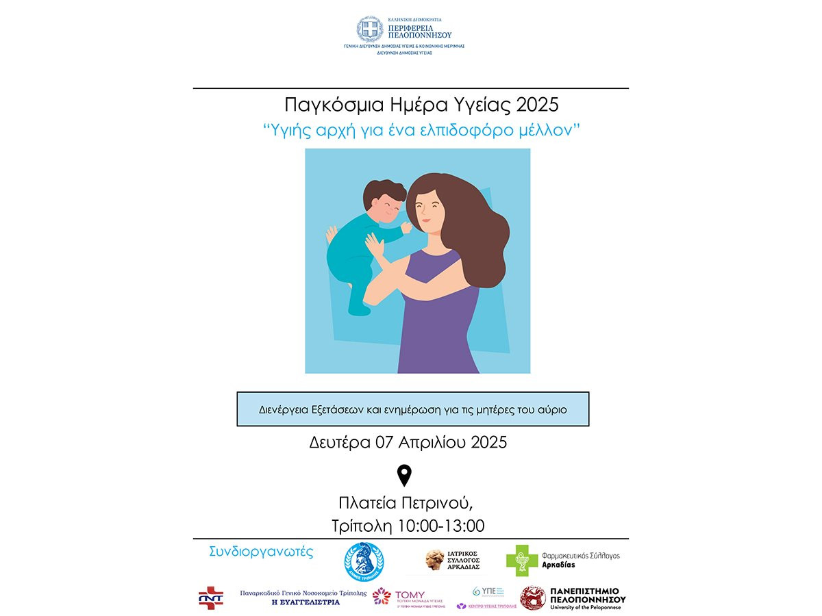 Με αφορμή την Παγκόσμια Ημέρα Υγείας, την Δευτέρα 07 Απριλίου 2025 πραγματοποιήθηκε με επιτυχία δράση ενημέρωσης και ευαισθητοποίησης κοινού, στην Πλατεία Πετρινού, στο κέντρο της Τρίπολης. Η εκδήλωση διοργανώθηκε από τη Γενική Διεύθυνση Δημόσιας Υγείας και Κοινωνικής Μέριμνας δια της Διεύθυνσης Δημόσιας Υγείας, στο πλαίσιο των στοχευμένων παρεμβάσεων για την ενίσχυση της πρόληψης και την προαγωγή της υγείας του πληθυσμού, με ιδιαίτερη έμφαση στη μητρική και νεογνική φροντίδα.