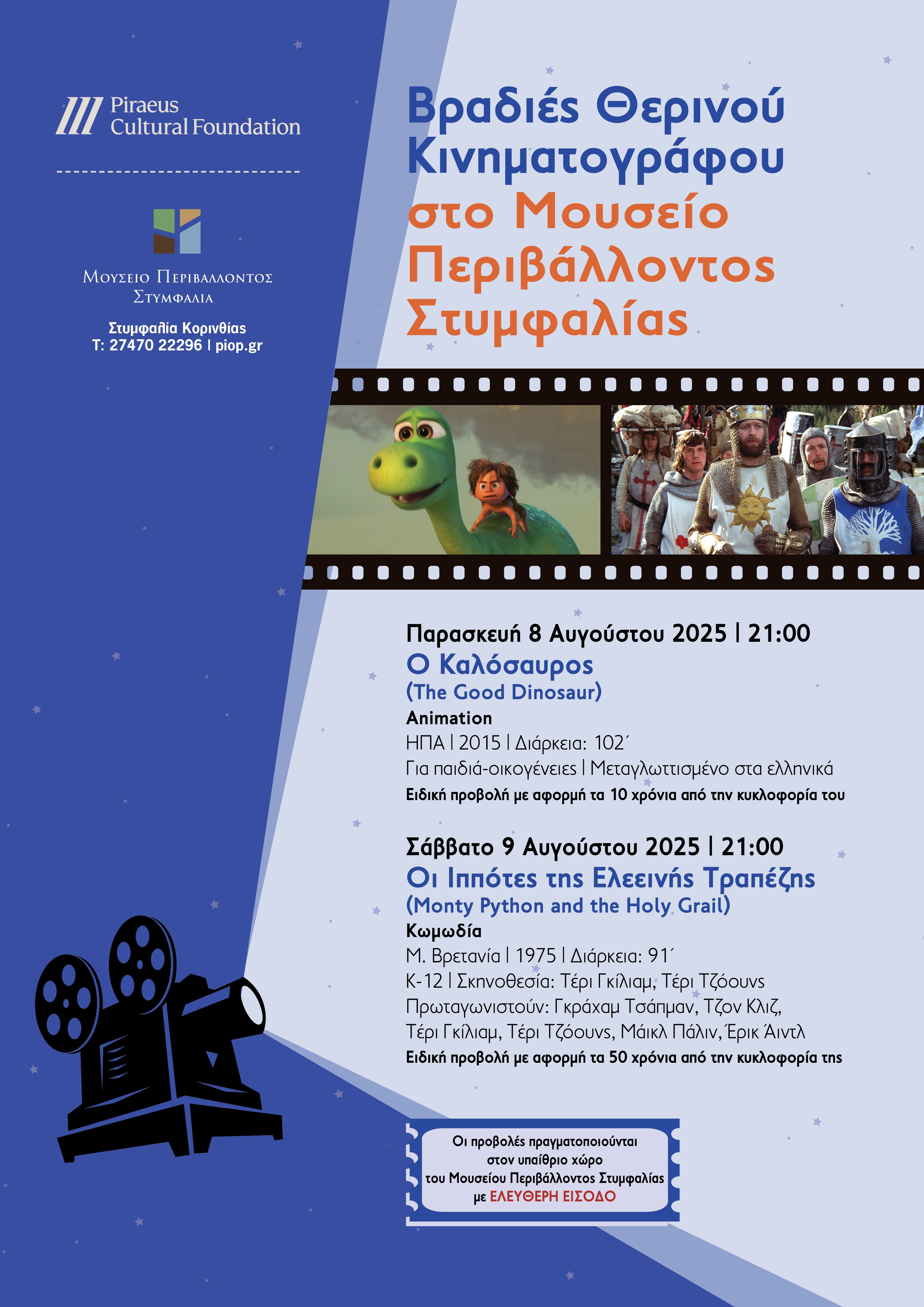 Tο Πολιτιστικό Ίδρυμα Ομίλου Πειραιώς οργανώνει δύο συναρπαστικές βραδιές θερινού κινηματογράφου, για μικρούς και μεγάλους, την Παρασκευή 8 και το Σάββατο 9 Αυγούστου 2025, στο Μουσείο Περιβάλλοντος Στυμφαλίας. Η είσοδος είναι ελεύθερη για το κοινό. Αναλυτικά οι προβολές: